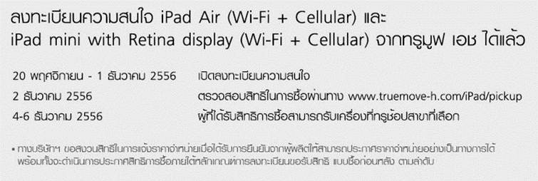 สิ้นสุดการรอคอยแล้วกับ iPad Air & iPad Mini Retina display เมื่อทรูมูฟ เอช ออกมาประกาศเปิดขาย iPad รุ่นใหม่ทั้ง 2 รุ่น เป็นรายแรกในไทย งานนี้ใครอยากได้ต้องลงทะเบียนความสนใจในเว็บเพื่อรับสิทธิ์ในการซื้อเครื่องเช่นเคยครับ http://www.truemove-h.com/iPad
