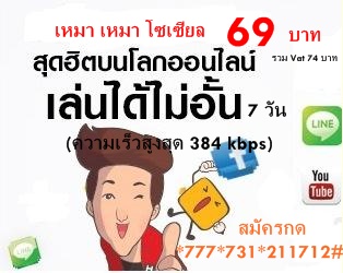 3G NETSIM (3G2100) Package แพ็กเกจหลัก 3GNETSIM Unlimit 300MB 89บาท/สัปดาห์ *777*311*211712# 3GNETSIM 90 MB 99 บาท *777*330*211712# 3GNETSIM 300 MB 199 บาท *777*331*211712# 3GNETSIM Unlimit 500MB 249 บาท *777*335*211712# 3GNETSIM Unlimit 1GB 399 บาท *777*399*211712# 3GNETSIM Unlimit 2GB 599 บาท *777*332*211712# 3GNETSIM Unlimit 4GB 799 บาท *777*334*211712# 3GNETSIM Unlimit 10GB 1699 บาท *777*1699*211712# --------------------------------------------------------------------------------------------- แพ็กเกจ3G2100 Entertainment Package 3G Entertainment อินเตอร์เน็ตไม่จำกัด 299 บาท สูงสุด500MB 320บาท *777*924*211712# (ฟรี e-magazine + ฟรี HD Movies+ฟรีแพ็กเกจ GMMZ) 3G Entertainment อินเตอร์เน็ตไม่จำกัด 899 บาท สูงสุด 5 GB 962 บาท *777*926*211712# (ฟรี AIS&3BB Wifi ไม่จำกัด + ฟรี e-magazine +ฟรี HD Movies 30 + ฟรีแพ็กเกจ GMMZ) --------------------------------------------------------------------------------------------- แพ็กเกจเสริม Internet (3G2100) Package Internet 90 MB รวมภาษี 106 บาท *777*990*211712# Internet 300 MB รวมภาษี 213 บาท *777*991*211712# Internet Unlimit 3 GB *สุดคุ้ม*** รวมภาษี 427บาท *777*996*211712# Internet Unlimit 2 GB รวมภาษี 641บาท *777*993*211712# Internet Unlimit 12GB *สุดคุ้ม*** รวมภาษี 855 บาท *777*998*211712# Internet Unlimit 10 GB รวมภาษี 1699 บาท *777*926*211712# --------------------------------------------------------------------------------------------- แพ็กเกจเหมา เหมา 3G Internet เหมา เหมา Internet 49 บาท รวมภาษี 53บาท *777*1*211712# --------------------------------------------------------------------------------------------- 3G2100 One time Internet Package แพ็กเกจเสริม Internet Unlimit 69 บาท ความเร็วสูงสุด 384 Kbps *ใหม่*** รวมภาษี 74 บาท *777*731*211712# --------------------------------------------------------------------------------------------- 3G2100 Combo Package 3G Combo 119 บาท Internet 75MB + 20SMS + 5MMS รวมภาษี 128บาท *777*010*211712# 3G Combo 179 บาท Internet 150MB + 30SMS + 5MMS รวมภาษี 192บาท *777*011*211712# --------------------------------------------------------------------------------------------- SMS & MMS Package 3G2100 SMS Package 50 ครั้ง 50 บาท รวมภาษี 54 บาท *777*002*211712# MMS Package 12 ครั้ง 50 บาท รวมภาษี 54 บาท *777*006*211712#