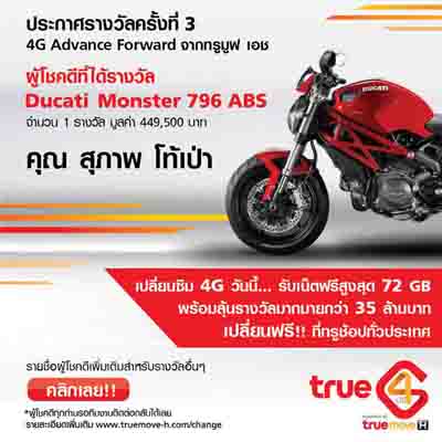 ประกาศรางวัลครั้งที่ 3 Ducati จาก 4G Advance Forward ตรวจสอบรายชื่อผู้โชคดีได้ที่นี่เลยจ้า http://goo.gl/qu3wmB เปลี่ยนซิม 4G วันนี้...รับเน็ตฟรีสูงสุด 72 GB พร้อมลุ้นรางวัลมากมายกว่า 35 ล้านบาท เปลี่ยนฟรี!! ที่ทรูช้อปทั่วประเทศ