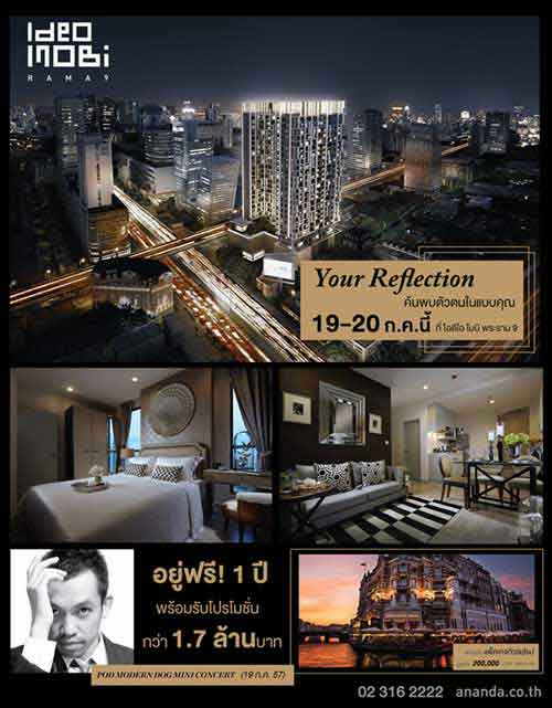 บมจ.อนันดา ดีเวลลอปเม้นท์ ผู้นำตลาดคอนโดมิเนียมติดรถไฟฟ้า ผู้พัฒนาโครงการไอดีโอ โมบิ พระราม 9 จัดแคมเปญใหญ่ Your Reflection ค้นพบตัวตนในแบบคุณ ห้องชุด 2 ห้องนอน พร้อมอยู่ ราคาเริ่มต้น 7.6 ล้านบาท ด้วยข้อเสนอพิเศษสุด อยู่ฟรี!!! 1 ปี และฟรีค่าใช้จ่ายการโอนกรรมสิทธิ์ พร้อมเฟอร์นิเจอร์หรูแบรนด์ ควอทโทร และเครื่องใช้ไฟฟ้าซัมซุงครบชุด รวมมูลค่ากว่า 1 ล้านบาท (จำนวนจำกัด) พร้อมรับแพ็คเกจทัวร์ยุโรป สิทธิ์ละ 2 ที่นั่ง มูลค่า 200,000 บาท โดยลูกค้าสามารถเข้าร่วมงานสุดพิเศษนี้ได้ในวันที่ 19-20 กรกฎาคมนี้ ชมมินิคอนเสิร์ตของศิลปินแถวหน้า ป็อด โมเดิร์นด็อก พร้อมชิมชิลล์กับอาหารสุดพิเศษจาก Mandarin Oriental ทั้งยังมีสิทธิ์ลุ้นรางวัลพิเศษ Samsung Galaxy S5 มูลค่า 23,800 บาท 2 รางวัล สำหรับผู้จองในงานรับส่วนลดเพิ่ม 100,000 บาท