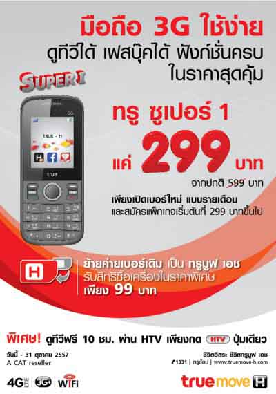 น่าสนใจ ใครกำลังหามือถือ 3G ใหม่ ตัวนี้ราคาถูกมาก True Super 1 ราคา 299 บาท ดูทีวี เล่นเฟสบุคได้ ฟังเพลง mp3 และวิทยุได้ แค่ย้ายค่ายหรือเปิดเบอร์ใหม่กับทรูมูฟ เอช ก็รับเครื่องไปเลย ไม่ติดสัญญา มีแพ็คเกจให้เลือกทั้ง เน้นเน็ต เน้นโทร สเปคเครื่องดูที่นี่ http://truemoveh.truecorp.co.th/product/detail/1612/True_Super_I#promotion