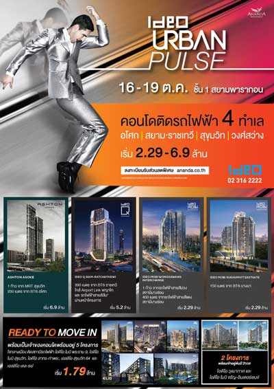 IDEO Urban Pulse โดยบริษัท อนันดา ดีเวลลอปเม้นท์ จำกัด (มหาชน) เปิดตัว 4 โครงการใหม่ใกล้ 7 สถานีรถไฟฟ้า พร้อมนำอีก 7 โครงการคุณภาพเยี่ยม ด้วยข้อเสนอสุดพิเศษแห่งปี 16-19 ตุลาคมนี้ ณ แฟชั่น ฮอลล์ ชั้น 1 ศูนย์การค้าสยามพารากอน
