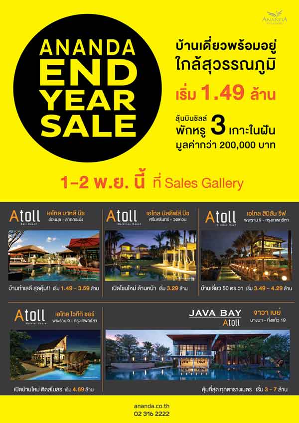 อนันดา ดีเวลลอปเม้นท์ จัดแคมเปญใหญ่ ANANDA END YEAR SALE ครั้งเดียวในรอบปีกับบ้านเดี่ยวพร้อมอยู่ในสไตล์โมเดิร์นรีสอร์ท ลีฟวิ่งโซนตะวันออกใกล้สุวรรณภูมิ ภายใต้แบรนด์ เอโทล (Atoll) 5 โครงการ เอโทล จาวาเบย์ บางนา-กิ่งแก้ว 19, เอโทล ไวกีกิ ชอร์ พระราม9 - กรุงเทพกรีฑา , เอโทล สิมิลัน รีฟ พระราม9 - กรุงเทพกรีฑา, เอโทล มัลดีฟส์ บีช ศรีนครินทร์ - วงแหวน และเอโทล บาหลี บีช อ่อนนุช - ลาดกระบัง ในราคาเริ่มต้นเพียง 1.49 ล้านบาท เพียงจอง พร้อมทำสัญญาภายในงานลุ้นบินชิลล์ พักหรู สู่ 3 เกาะในฝันมูลค่ากว่า 200,000 บาท โครงการไวกีกิ ชอร์ ลุ้นแพ็คเกจทัวร์เกาะมัลดีฟส์ , โครงการสิมิลัน รีฟ และจาวา เบย์ ลุ้นแพ็คแกจทัวร์บาหลี และโครงการบาหลี บีชกับมัลดีฟส์ บีช ลุ้นแพ็คแกจทัวร์ภูเก็ต พร้อมข้อเสนอสุดพิเศษพบโปรฯ 100% ฟรี!!! ทุกรายการ อาทิ ฟรีค่าธรรมเนียมการโอน, ค่าส่วนกลาง 1 ปี, ค่าประกันมิเตอร์น้ำ, ค่าประกันมิเตอร์ไฟ, เครื่องปรับอากาศ, ปูหญ้า, ถังน้ำสำรอง, ปั๊มน้ำ, Cash Back มูลค่ารวมสูงสุดกว่า 150,000 บาท* และพิเศษกว่ารับฟรี!! iPhone 6 ทุกหลัง* (เงื่อนไขเป็นไปตามที่บริษัทฯกำหนด) พลาดไม่ได้ เฉพาะวันที่ 1 - 2 พ.ย. นี้เท่านั้น ณ. โครงการที่ร่วมรายการ สนใจสามารถสอบถามรายละเอียดเพิ่มเติมได้ที่ โทร.02-316-2222