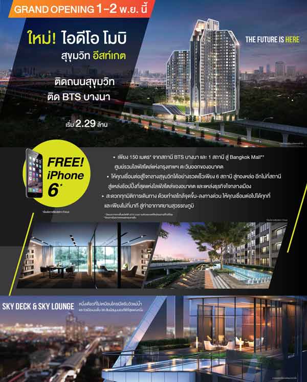 ไอดีโอ โมบิ สุขุมวิท อีสท์เกต คอนโดติดรถไฟฟ้าสถานีบางนา เพียง 150 เมตร เริ่ม 2.29 ล้าน จองในงาน Grand Opening ฟรี! iPhone 6 ระหว่าง 1-2 พ.ย.นี้เท่านั้น