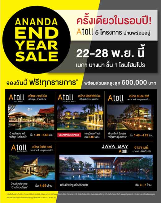 อนันดา ดีเวลลอปเม้นท์ จัดแคมเปญใหญ่ ANANDA END YEAR SALE ครั้งเดียวในรอบปีกับบ้านเดี่ยวพร้อมอยู่ในสไตล์โมเดิร์นรีสอร์ท ลีฟวิ่งโซนตะวันออกใกล้สุวรรณภูมิ ภายใต้แบรนด์ เอโทล (Atoll) 5 โครงการ เอโทล จาวาเบย์ บางนา-กิ่งแก้ว 19, เอโทล ไวกีกิ ชอร์ พระราม9 - กรุงเทพกรีฑา, เอโทล สิมิลัน รีฟ พระราม9 - กรุงเทพกรีฑา, เอโทล มัลดีฟส์ บีช ศรีนครินทร์ - วงแหวน และเอโทล บาหลี บีช อ่อนนุช - ลาดกระบัง จองวันนี้!!! ฟรีทุกรายการ รับส่วนลดสูงสุด 600,000 บาท รับเพิ่มฟรี Iphone 6 ทุกหลัง พร้อมลุ้นเที่ยวฟรี !! มัลดีฟส์ มูลค่ากว่า 80,000 บาท และบาหลี มูลค่า 40,000 บาท ในราคาเริ่มต้น 1.49 - 6.59 ล้านบาท (เงื่อนไขตามที่บริษัทฯกำหนด) เตรียมพบกับข้อเสนอสุดพิเศษ ตั้งแต่วันนี้ - 28 พ.ย. นี้ ณ. ชั้น 1 โซน Homepro เมกาบางนา สอบถามรายละเอียดเพิ่มเติมได้ที่โทร.02-316-2222 หรือ www.ananda.co.th