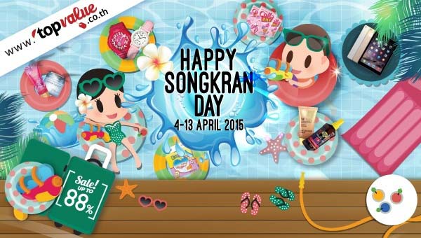 Topvalue ช้อปปิ้งออนไลน์แห่งใหม่ ร่วมมอบความสุขต้องรับเทศกาลสงกรานต์ด้วยส่วนลดพิเศษสูงสุดถึง 88% เพื่อเอาใจหนุ่มสาวนักช็อป โดยมีสินค้าแฟชั่นสุดชิคมากมายให้คุณได้เลือกช็อป กันแบบสบายๆ อาทิเช่น เสื้อผ้า กระเป๋า รองเท้า สีสันสดใสต้อนรับ Summer เครื่องสำอางกันน้ำ และครีมกันแดด หลากหลายแบรนด์ดัง อีกทั้งยังมีปืนฉีดน้ำให้เลือกมากมายสำหรับผู้ที่พร้อมจะออกไปสาดน้ำกันอย่างสนุกสุดมันส์ รวมไปถึงสินค้าคุณภาพอีกคับคลั่งนับหมื่นรายการ ยกมาให้คุณช้อปกระจายผ่านโลกออนไลน์ตลอด 24 ชั่วโมง พร้อมบริการรับชำระเงินปลายทาง ให้ผู้ซื้อไม่ต้องกังวลในการสั่งซื้อสินค้า สร้างประสบการณ์ที่เหนือกว่า ยกระดับการซื้อขายบนโลกออนไลน์ สะดวกสบาย และมั่นใจได้ยิ่งขึ้น ให้คุณประทับใจทุกครั้ง เมื่อได้ช้อปปิ้งกับเรา คลิกเลยตั้งแต่ 4 - 13 เมษายน 2558 นี้ ขาช๊อปห้ามพลาด! https://www.topvalue.co.th/songkran-day