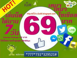 รายละเอียดโปรเน็ต : - 3G 2100 One time Internet Package เหมา เหมา โซเชี่ยว 69 บาท/สัปดาห์ เล่นเน็ตแบบต่อเนื่องนาน 7 วัน - ใช้ความเร็วได้สูงสุด 384Kbps เล่นได้ถึง 750MB หลังจากนั้นเล่นเน็ตแบบต่อเนื่องที่ความเร็ว 64Kbps ไปจนครบ 7 วัน - โปรเน็ตนี้ไม่ต่ออายุอัตโนมัติ - ราคา 69 รวมภาษี7%=73.83บาท