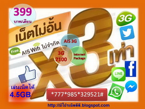 AIS 3G 2100 โปรเน็ตไม่จำกัด 399 บาท/เดือน ปกติ เล่นเน็ตได้ 1.5GB ฟรีเพิ่มเน็ตให้อีกX3เท่า รวมเป็น 4.5GB
