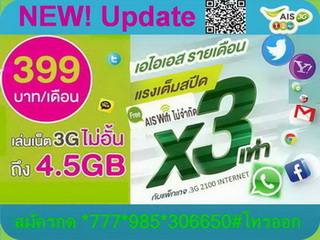 Internet Package ไม่จำกัด 399 บาท ใช้ความเร็วสูงสุดรวม 1.5 GB ฟรี เน็ต X3 รวม 4.5GB (ฟรี AIS WiFi ไม่จำกัด) ราคา399 บาท/เดือน (+vat =426.93 ) สมัครกด *777*985*306650#โทรออก