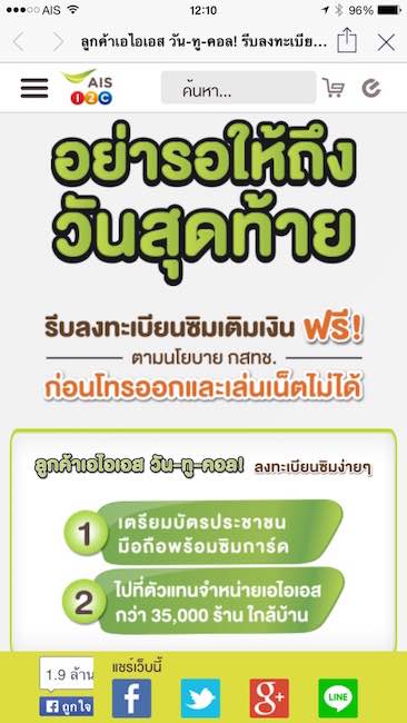 วันนี้เห็น Line AIS เด้งเตือนขึ้นมาก็เลยพึ่งจะนึกได้ว่า ผมก็ยังไม่ได้ไปลงทะเบียน sim นี่หว่า หมดเขตสิ้นเดือนนี้แล้วด้วย อย่าลืมไปลงทะเบียนกันนะฮ๊าฟฟ แจ้งเตือนด้วยความหวังดี
