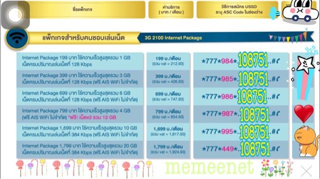 🍭Internet Package ไม่จำกัด 399 บาท ใช้ความเร็วสูงสุดรวม เน็ต 3GB (ฟรี AIS WiFi ไม่จำกัด) 399 บ./เดือน (+vat =426.93 ) ขายดีมาก 🍬 สมัครกด *777*985*108751#โทรออก