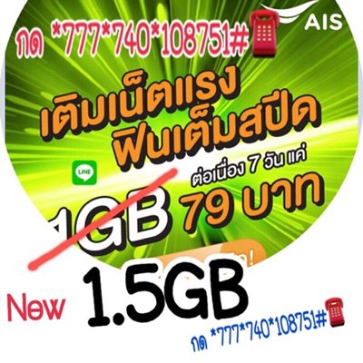 📗แพ็ก 79 บาท เล่นเน็ตได้ไม่จำกัด ความเร็ว 512 Kbp 24 ชม. ความเร็วสุงสุด 1.5 GB (+7%=84.53) กดสมัคร *777*740*108751#โทรออก