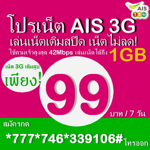 โปรเน็ตเอไอเอส 99 บาท/สัปดาห์ (รวมภาษีแล้ว=105.93) เล่นได้ได้ 1GB ใช้ความเร็วสูงสุด 42Mbps. วิ่งค่ามาตรฐานของ 3G เร็วแรงเติมสปีด เมื่อเล่นเน็ตครบกำหนด 1GB แล้ว แต่เวลายังเหลือหากมีการเปิดเชื่อมต่ออินเตอร์เน็ต ระบบคิดเงินเพิ่มคือ 1MB ต่อ 1.5 บาท