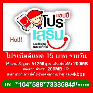 โปรเน็ตดีแทค 15 บาท 1 วัน สมัครกด *104*855*7333584#โทรออก เล่นเน็ตได้ 200MB ใช้ความเร็วสูงสุด 512kbps. หลังจากเล่นเน็ตครบ 200MB สามารถเล่นเน็ตต่อเนื่องที่ความเร็ว 64kbps ราคา 15 บาท(รวมภาษีแล้ว = 16.05บาท) ลูกค้าควรมีเงินในซิมให้เพียงพอสำหรับแพ็กเกจไม่ต่ำกว่า 17 บาท และสาามารถบันทึกรหัส *104*855*7333584# ไว้ในซิมได้เลยจ้า