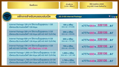 โปรเน็ต AIS รายเดือน โปรเน็ตเอไอเอส 199 บาท 30 บาท สมัครกด *777*984*339106#โทรออก ใช้ความเร็วสูงสุด 42Mbps เล่นเน็ตได้รวม 1GB+เน็ตไม่จำกัด 128kbps (ราคารวมภาษี7% = 212.93บาท)