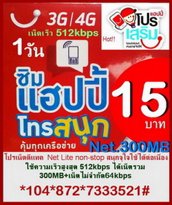 2. โปรเน็ตดีแทค 15 บาท รายวัน (รวมVat=16.05บาท) สมัครกด *104*872*7333584#โทรออก เล่นเน็ต 3G ได้ถึง 300MB ใช้ความเร็วสูงสุด 512Kbps. หลังจากเล่นเน็ตหมด 300MB สามารถเล่นเน็ตต่อเนื่องได้ที่ความเร็ว 64Kbps.