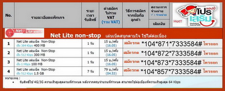 โปรเน็ตดีแทค รายวัน 15 บาท สมัครกด *104*872*7333584# โทรออก รับสิทธิ์ใช้เน็ตดีแทค 4G/3G เน็ตดีแทค Net Lite เล่นเน็ต Non-Stop ความเร็วสูงสุด 512 kbps ใช้เน็ตได้ถึง 300MB จากนั้นใช้เน็ตไม่จำกัด เร็ว 64 kbps (ราคา 15 บ.รวมภาษี7%=16.05บ.)