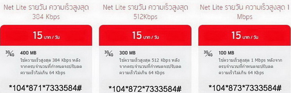 2. โปรเน็ตดีแทค 15 บาท รายวัน (รวมVat=16.05บาท) สมัครกด *104*872*7333584#โทรออก เล่นเน็ต 3G ได้ถึง 300MB ใช้ความเร็วสูงสุด 512Kbps. หลังจากเล่นเน็ตหมด 300MB สามารถเล่นเน็ตต่อเนื่องได้ที่ความเร็ว 64Kbps. ----------------------------------------------------------------------------------------------------------------------------------