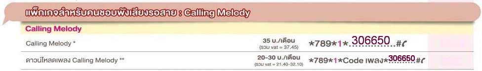 เสียงเพลงรอสาย ของเอไอเอส AIS Calling Melody รายเดือน ราคา 35 บาท/เดือน(รวมภาษี7%=37.45) สมัครกด *789*1*306650#โทรออก