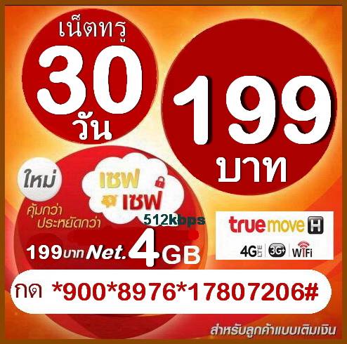 เน็ตทรูรายเดือน 199 บาท เล่นเน็ตได้ 4GB ความเร็ว 512kbps เล่นครบ4GBเล่นเน็ตต่อเนื่องแบบไม่จำกัดที่ความเร็ว64kbps แพ็กนี้ถือว่าโอเคนะคะ หากเล่นเฟส ไลน์ ดูคลิปบ้าง สนใจสมัครได้เลยจ้า กด *900*8976*17807206# โทรออก