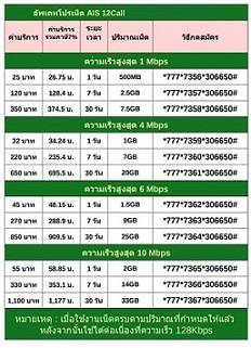 +เน็ตAIS 9 บาทเล่นเน็ตได้ 100 MB นาน 24 ชม. กด *777*70*306650# โทรออก +เน็ตAIS 15 บาทเล่นเน็ตได้ไม่จำกัด 512 kbps นาน 24 ชม. กด *777*210*306650# โทรออก +เน็ตAIS 15 บาทเล่นเน็ตได้ 200 MB นาน 24 ชม. กด *777*71*306650# โทรออก +เน็ตAIS 14 บาท เล่นเน็ตไม่จำกัด 384kbps นาน 24 ชม. กด *777*738*306650# โทรออก +เน็ตAIS 59 บาทเล่นเน็ตได้ 1GB นาน 3 วัน กด *777*402*306650# โทรออก +เน็ตAIS 69 บาทเล่นเน็ต384kbpsได้ 1G(ต่อเนื่องไม่จำกัด) นาน 7วัน กด *777*731*306650# โทรออก +เน็ตAIS 79 บาทเล่นเน็ต512kbpsได้ 1.5GB(ต่อเนื่องไม่จำกัด) นาน 7วัน กด *777*740*306650# โทรออก +เน็ตAIS 199 บาทเล่นเน็ตได้ไม่จำกัด 1GB นาน 30วัน กด *777*984*306650# โทรออก +เน็ตAIS 699 บาทเล่นเน็ตได้ไม่จำกัด 6GB นาน 30วัน กด *777*986*306650# โทรออก +เน็ตAIS 799 บาทเล่นเน็ตได้ไม่จำกัด 12GB นาน 30วัน กด *777*987*306650# โทรออก ----------------------------------------------------------------------------------------------------------------------------------