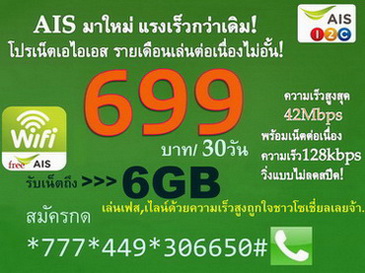 หลังจากเล่นเน็ตครบ 6 GB ยังสามารถเล่นเน็ตต่อเนื่องที่ความเร็ว 128Kbps ไปจนครบ 30 วัน (ฟรี AIS WiFi ไม่จำกัด) ราคา 699 บาท/เดือน (+vat = 747.93)