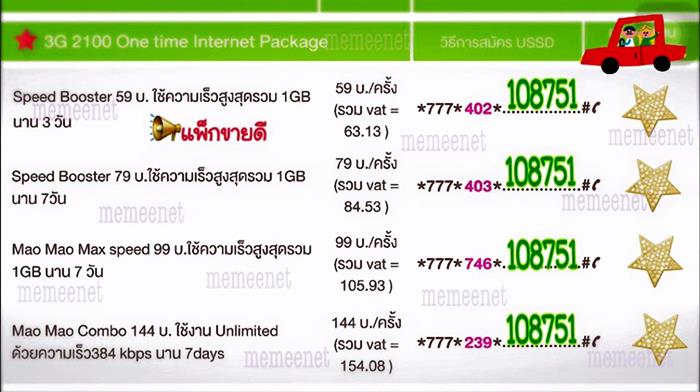 ▪ Internet Package ไม่จำกัด 69 บาท ใช้เน็ตความเร็วสูงสุด 384Kbps ได้รวม 1GB หลังจากนั้นใช้ได้ไม่จำกัดที่ความเร็ว 64Kbps นาน 7 วัน ราคา 69 บาท/สัปดาห์ (+vat =73.83 )