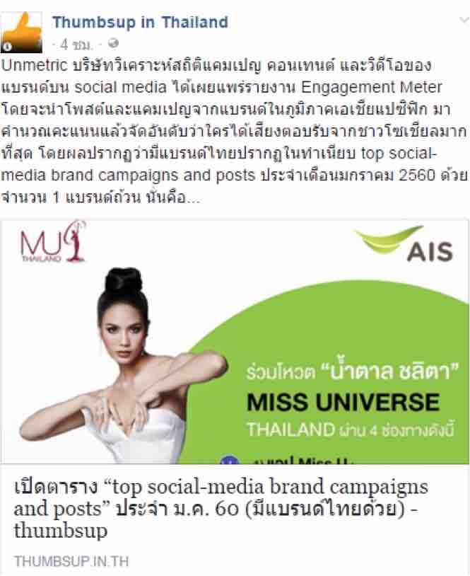 Unmetric เป็นบริษัทวิเคราะห์สถิติแคมเปญ คอนเทนต์ และวิดีโอของแบรนด์บน social media ล่าสุด Unmetric เปิดรายงานชื่อ Engagement Meter ซึ่งนำโพสต์และแคมเปญจากแบรนด์ในภูมิภาคเอเชียแปซิฟิก มาคำนวณคะแนนแล้วจัดอันดับว่าใครได้เสียงตอบรับจากชาวโซเชียลมากที่สุด โดยผลปรากฏว่ามีแบรนด์ไทยปรากฏในทำเนียบ top social-media brand campaigns and posts ประจำเดือนมกราคม 2560 ด้วยจำนวน 1 แบรนด์ถ้วน
