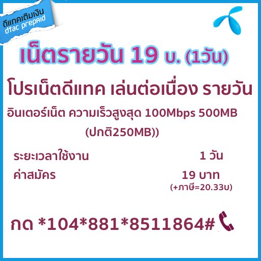 โปรเสริมเน็ตดีแทค 19 บาท/ 1 วัน ที่ความเร็วสูงสุด 500MB สมัครกด *104*881*8511864#โทรออก