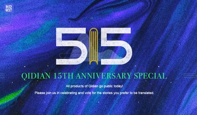 คำอธิบายภาพ: 1. หน้าพิเศษเนื่องในโอกาสขวบปีที่ 15 ของ Qidian International 2. หมวดวรรณกรรมยอดนิยมในหน้าโฮมเพจของ Qidian International 3. โลโก้และคิวอาร์โค้ด
