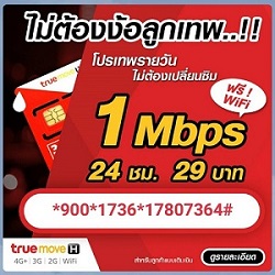 โปรเน็ต ทรู 29 บาท เน็ต 1 mbps ไม่ลดสปีด 24 ชั่วโมง วิธีสมัครกด*900*1736*17807364#โทรออก รายละเอียดโปรโมชั่น เน็ต 1 mbps 29 บาท :สามารถใช้งานอินเตอร์เน็ต ของ TrueMove H 4G/ 3G แบบ เน็ตไม่จำกัดปริมาณ เน็ตไม่ลดสปีดตลอด อายุการใช้งาน 1 วัน +เล่นWiFi ฟรีไม่อั้น 24 ชั่วโมง ราคารวมภาษี 7%= 31.03 บาท