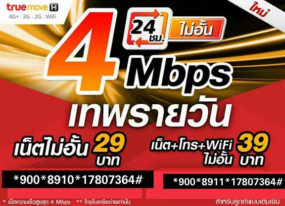 สมัครกด*900*8911*17807364#โทรออก ใช้งานเน็ตทีุ่ความเร็ว 4 Mbps ไม่ลดสปีดตลอด 1 วัน+โทรฟรีทรูมูฟ เอช ไม่อั้น +เล่นฟรี wifi เล่นได้เบิ้ลๆ 3 อย่างเลย ราคารวม ภาษี=41.73 บาท