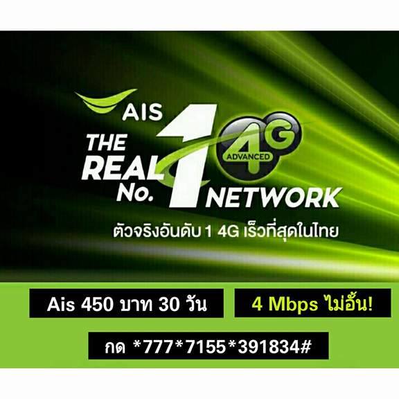 โปรเน็ต AIS ราคา 450บาท 30วัน สมัครกด*777*7155*391834#โทรออก รายละเอียด ใช้งานอินเทอร์เน็ตที่ความเร็วสูงสุด 4 Mbps[เมกะบิต]ไม่อั้น ไม่ลดสปีด ตลอดการใช้งาน ดูยูทูป คลิป HD และเล่นได้ทุกแอพ