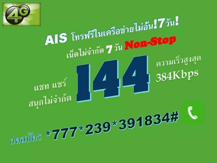 โปร โทร+เน็ต AIS 144บาท /สัปดาห์ สมัครกด*777*239*391834#โทรออก รายละเอียด สามารถใช้งานอินเทอร์เน็ต ที่ความเร็วสูงสุด 384 Kbps+โทรฟรี AIS ไม่อั้น ครั้งละไม่เกิน 60 นาที