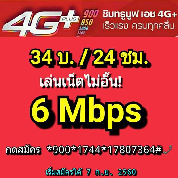 โปรเน็ตทรูมูฟเอช รายวัน 34 บาท 1วัน เน็ต 6 Mbps ไม่ลดสปีด [+vat=36.38บาท สมัครก*900*1744*17807364#โทรออก เล่นเน็ตทรูมูฟเอชที่ความเร็วสูงสุด 6 Mbps ไม่ลดสปีดตลอดอายุการใช้งาน เล่นเน็ตทุกแอพไม่อั้น