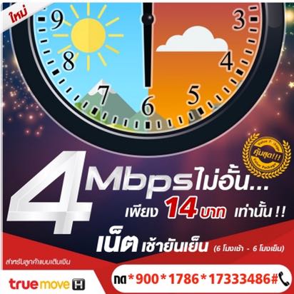 ใหม่! โปรเน็ตทรูมูฟ เอช เน็ตไม่อั้น เช้ายันเย็น เพียง14 บาทเท่านั้น!!(+vat7%=14.98บาท) เน็ตไม่อั้น 4Mbps สมัคร กด *900*1786*17333486#โทรออก