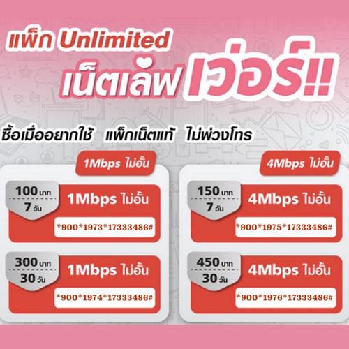 เน็ตเลิฟเวอร์ เน็ตทรูไม่อั้น ไม่ลดสปีด รายสัปดาห์ ,รายเดือน สำหรับคนรักเน็ต เน็ตทรูไม่อั้น ไม่ลดสปีด 1Mbps 7 วัน 100 บาท(+vat=107บาท) สมัครกด*900*1973*17333486#โทรออก >> เน็ตทรูไม่อั้น ไม่ลดสปีด 4Mbps 7 วัน 150 บาท(+vat=160.5บาท) สมัครกด*900*1975*17333486#โทรออก >> เน็ตทรูไม่อั้น ไม่ลดสปีด 1Mbps 30 วัน 300 บาท(+vat=321บาท) สมัครกด*900*1974*17333486#โทรออก >> เน็ตทรูไม่อั้น ไม่ลดสปีด 4Mbps 30 วัน 450 บาท(+vat=481.5บาท) สมัครกด*900*1976*17333486#โทรออก