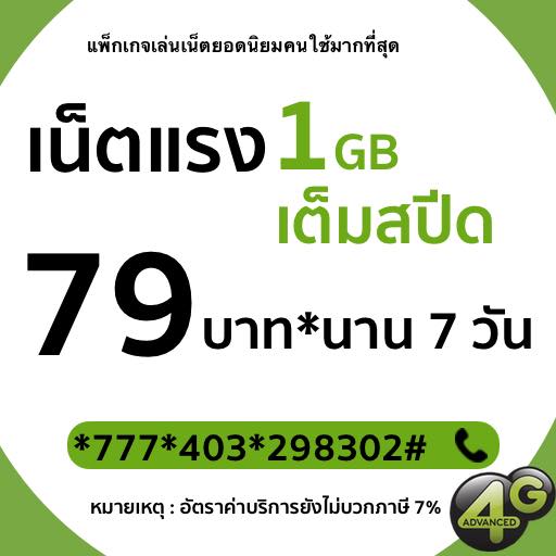 โปรเน็ต AIS 3G/4G เน็ตเต็มสปีด 1GB รายสัปดาห์ 79 บาท(+vat=84.53บาท) สมัครกด *777*403*298302#โทรออก