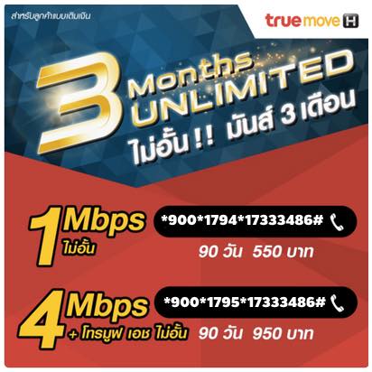 มาใหม่ล่าสุด! เน็ตทรูไม่อั้น 1Mbps 550 บาท(+vat=588.5บาท) 90 วัน สมัครกด *900*1794*17333486#โทรออก