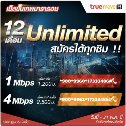 เน็ตทรูไม่อั้น เน็ตขั้นเทพมาราธอน Unlimited 12 เดือน 1Mbps 1,200 บาท เน็ตไม่อั้น ,4Mbps 2,500 บาท