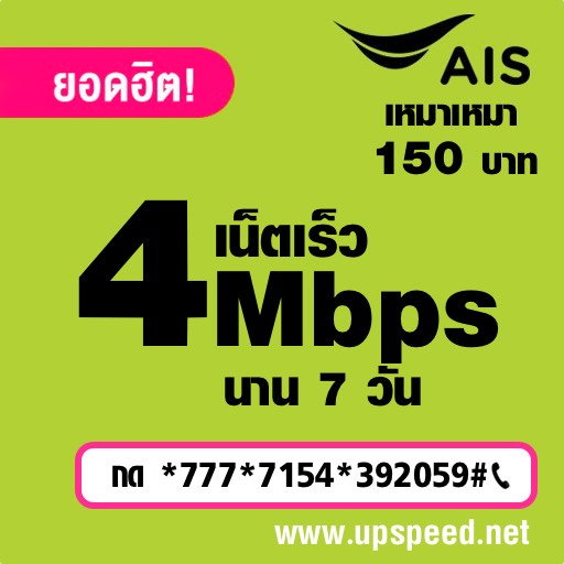 โปรเน็ต AIS เน็ตไม่อั้น 4Mbps รายสัปดาห์ 150 บาท ใครรออยู่ไม่ควรพลาด เน็ต ais แบบไม่ลดสปีด ความเร็ว 4 เมก เน้นเน็ตไม่ได้รวมค่าโทร เล่นเน็ตจุใจ เล่นเฟส เล่นไลน์ ดูยูทูป เน็ตไม่หมด ไม่ลดสปีด รายสัปดาห์
