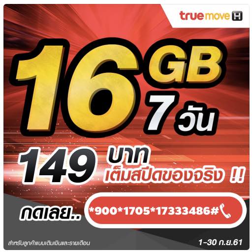 เน็ตทรูเต็มสปีด ของจริง!! เน็ตทรูเต็มสปีด 16GB 7 วัน 149 บาท (+vat=159.43บาท) สมัครกด *900*1705*17333486#โทรออก