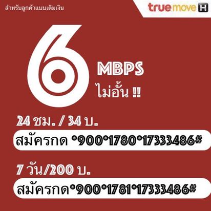 เน็ตทรูไม่อั้น 6Mbps 24ชม. 34 บ. สมัครกด *900*1780*17333486#โทรออก เน็ตทรูไม่อั้น 6Mbps 7 วัน 200 บ. สมัครกด *900*1781*17333486#โทรออก หมายเหตุ:ค่าบริการยังไม่รวมภาษีมูลค่าเพิ่ม7%