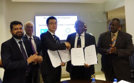 คำบรรยายภาพ: "คุณซังยูน ลี ประธานโลคัส เชน ฟาวน์เดชั่น ลงนามข้อตกลงความร่วมมือเชิงกลยุทธ์กับนายเตโอเร มูกาลู เลขาธิการอาวุโสแห่งสาธารณรัฐประชาธิปไตยคองโก