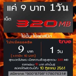 เน็ตทรูมูฟ เอช 9 บาท (รอบใหม่ 1-10 ตุลาคม 2561) เน็ต ทรูมูฟ เอช ใหม่ เดือนตุลาคม 2561 เน็ตแค่ 9 บาท แรงเต็มสปีด 100 Mbps ในปริมาณ 320 MB เมื่อครบ หลังจากนั้นเล่นได้ต่อเนื่องที่ความเร็ว 128Kbps ตลอด 24 ชม. รับสมัครกันนะคะ