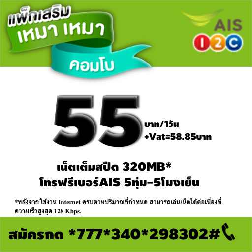 แนะนำสุดๆ สำหรับแพ็กเกจอินเตอร์เน็ตรายวันแบบ เหมา เหมา ของเอไอเอส ได้เน็ตแรงเต็มสปีด 320MB.(หลังจากใช้งาน Internet ครบตามปริมาณ 320MBที่กำหนด สามารถเล่นเน็ตได้ต่อเนื่องที่ความเร็วสูงสุด 128 Kbps.)ในเวลา 1 วัน พร้อมโทรฟรีเบอร์AIS ตั้งแต่เวลา 5ทุ่ม-5โมงเย็น ค่าสมัคร 55 บาท วิธีสมัคร เพียงกดรหัสสมัครจากมือถือด้วยตัวเอง *777*340*298302#แล้วกดโทรออก ค่าสมัครหลังบวกภาษี เพียง 58.85 บาท เท่านั้นแต่ได้เล่นเน็ตแรงๆ น่าจะถูกใจลูกค้า สายแรงๆวันเดียวค่ะ