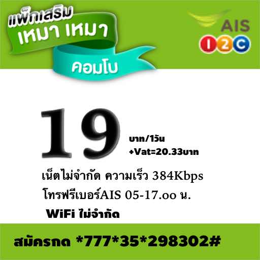 วันนี้ขอแนะนำ โปรโมชั่นแพ็กเกจเสริมเน็ตของ AIS ที่เรียกได้ว่าคุ้มค่า เพราะได้ทั้งอินเตอร์เน็ตไม่จำกัด ที่ความเร็วสุงสุด 384 Kbps พร้อมโทรฟรีในเครือข่าย เอไอเอส ตั้งแต่เวลา ตี 5 - 5โมงเย็น รวมทั้งเล่นฟรีwifi แบบไม่จำกัด ส่งข้อความ SMS ฟรี 10 ข้อความ MMS 5 ข้อความ ซึ่งนับว่าคุ้มมากๆ ในเวลา 1 วัน กับราคา 19 บาท