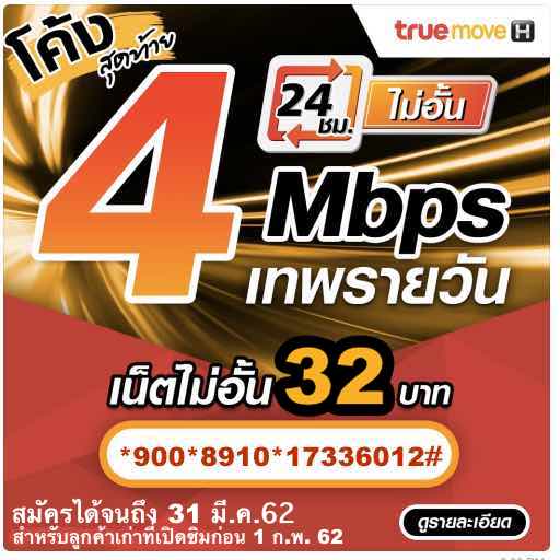 โค้งสุดท้าย!! เน็ตทรูไม่อั้น เน็ตเทพรายวัน 4Mbps 24 ชม. 32 บาท(บวกภาษี=34.24บาท)