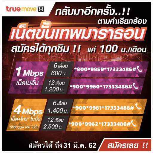 เน็ตทรูไม่อั้น 4Mbps + โทรในเครือข่ายไม่อั้น 3 เดือน 1,200บ.กด*900*1795*17336012#โทรออก 6 เดือน 2,100บ.กด*900*9961*17336012#โทรออก 12 เดือน 3,600บ.กด*900*9962*17336012#โทรออก