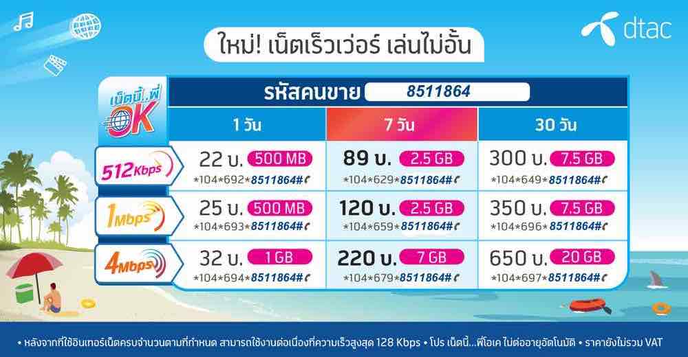 โปรเน็ต dtac 89 บาท ความเร็ว 512Kbps ปริมาณเน็ต 2.5GB ใช้นาน 7 วัน สมัครกด *104*629*8511864#โทรออก